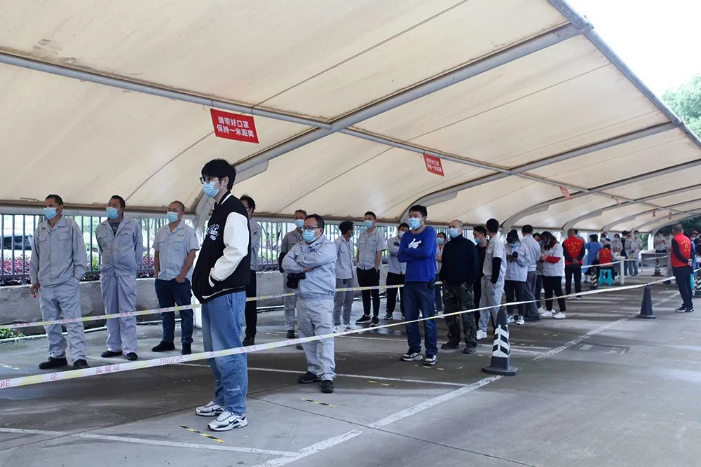 為方便檢測的同時盡最大努力減低員工被感染的風險,公司共設置兩處監測點,要求各事業部人員分時段檢測,參檢人員按照事業部劃分批次,有序排隊進行,大家自覺佩戴口罩,保持一米距離,積極配合醫護人員完成采樣。